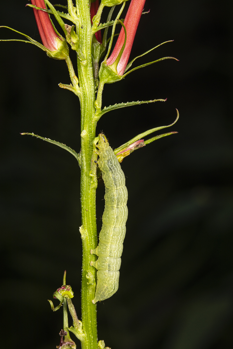 These moths must have a spotty distribution as I have local friends with plenty of Cardinal Flowers in their gardens that have no issues. But, someone in a local native plant group recently posted a photo of their defoliated plants (both Cardinal Flower and Great Blue Lobelia – these larvae are apparently Lobelia specialists) asking people to help figure out what was happening. They had a rabbit fence around their garden but still suspected some sort of mammal. Various comments suggested deer or a rabbit somehow evading the fence. I commented on their post and suggested they look closely for these little green caterpillars. They quickly responded that my theory was “spot on” and their plants had several of the voracious little larvae.