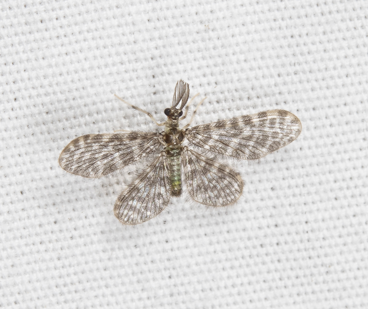 -I saved the coolest critter until last. Our friend and Museum scientist, Chris Goforth, had recently posted about this unusual insect when one came to her moth light. It is a tiny moth-like insect known as a Pleasing Lacewing, Nallachius americanus. It is related to antlions. This one is a male as indicated by the very feathery antennae (females’ are more filiform). Not much is known about these minuscule bugs, but the larvae are believed to feed on beetles and ants (especially eggs and larvae) under tree bark.