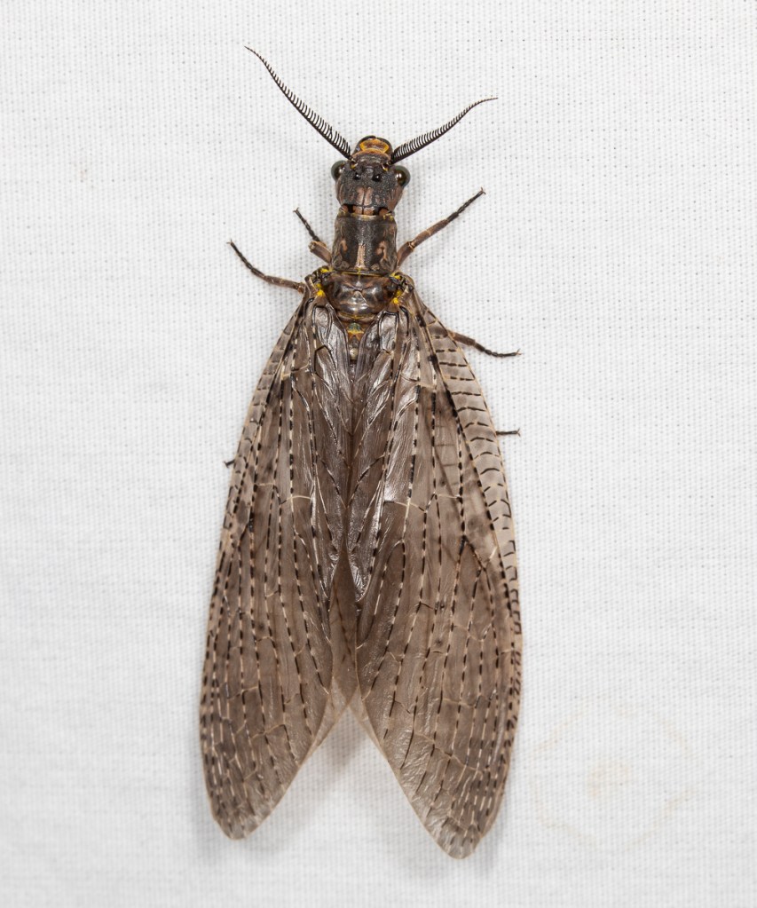 -Summer Fishfly – related to the larger Dobsonflies, but males lack the tusk-like mandibles of male Dobsonflies. This is a female, as her antennae only have the cob-like teeth on one side (males have feathery antennae).