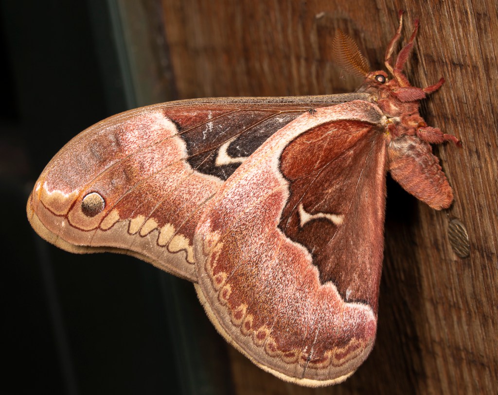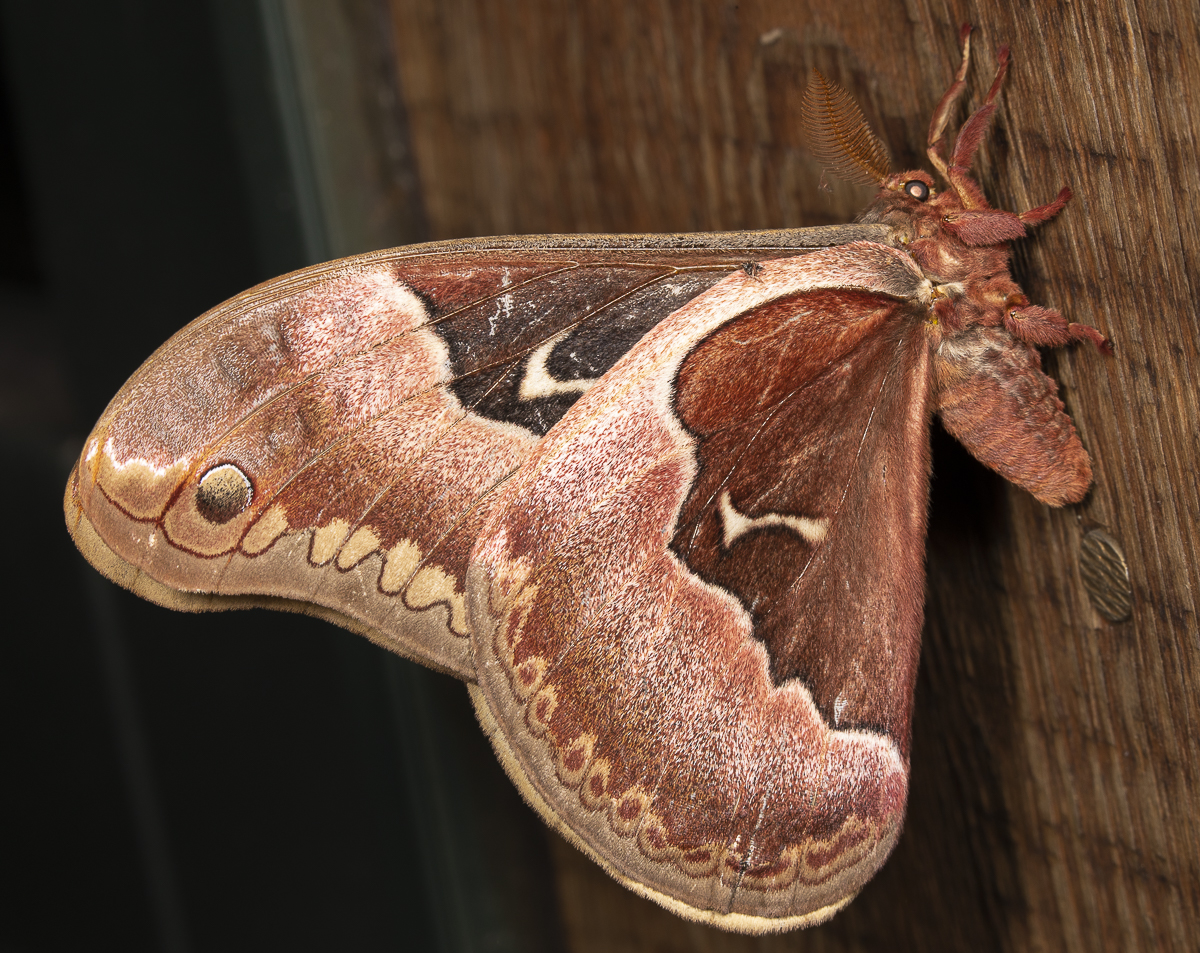 -Rosy Maple Moth. One of our favorites, this beauty is a member of the Giant Silk Moth family, though it is not nearly as large as many of its cousins. We find the larvae mainly on maples. Adults, like other members of this family, have no functional mouth parts and do not feed.