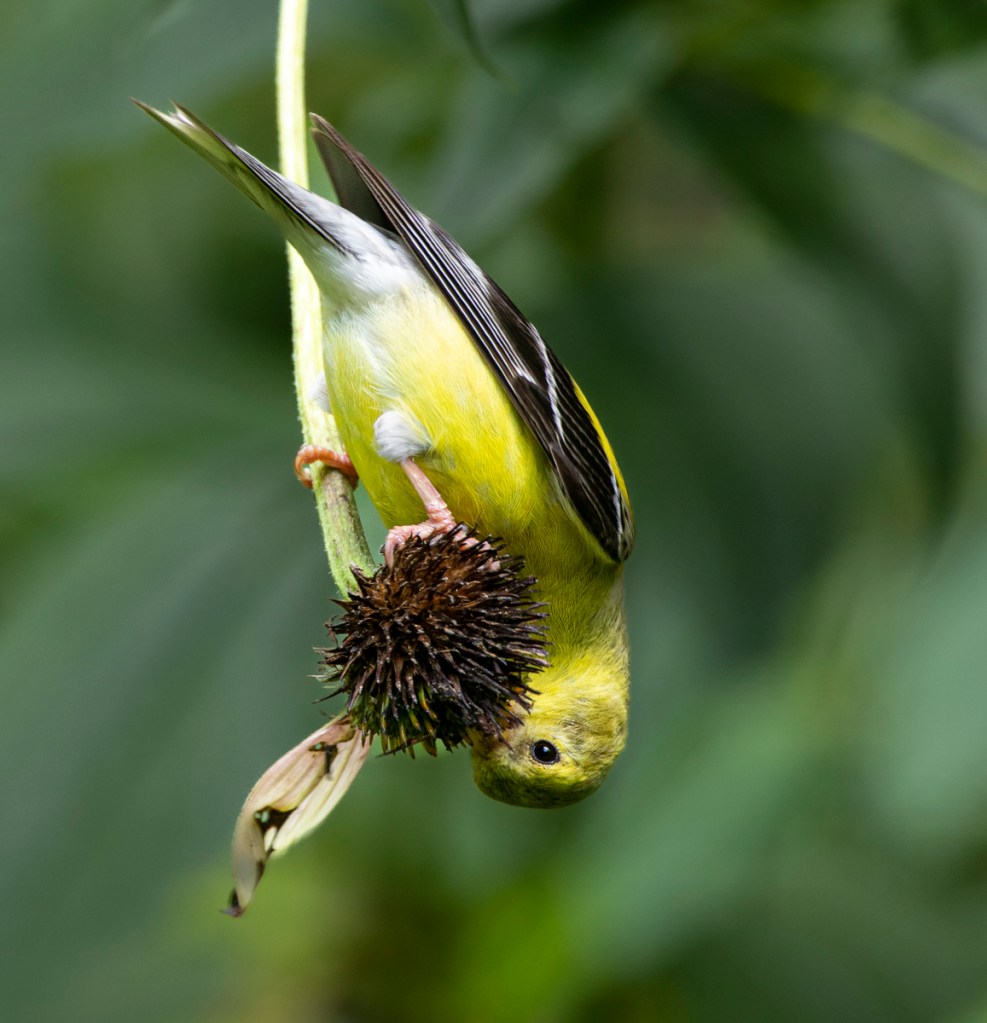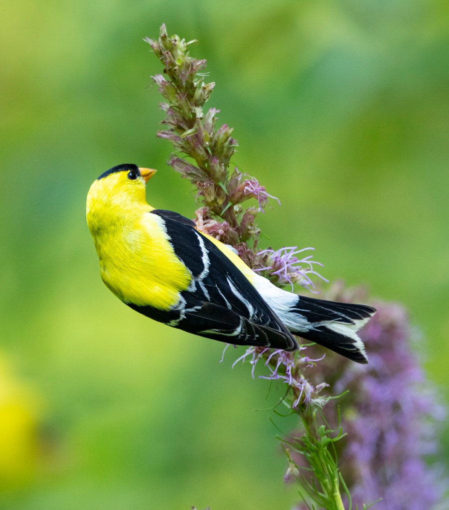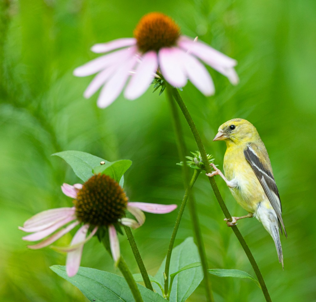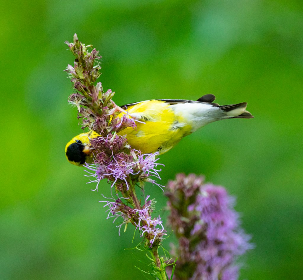 American Goldfinches are definitely one of the highlights of the bird life outside our windows. Their bright colors, cheery songs, and undulating flight are all another great reason to surround yourself with native wildflowers.