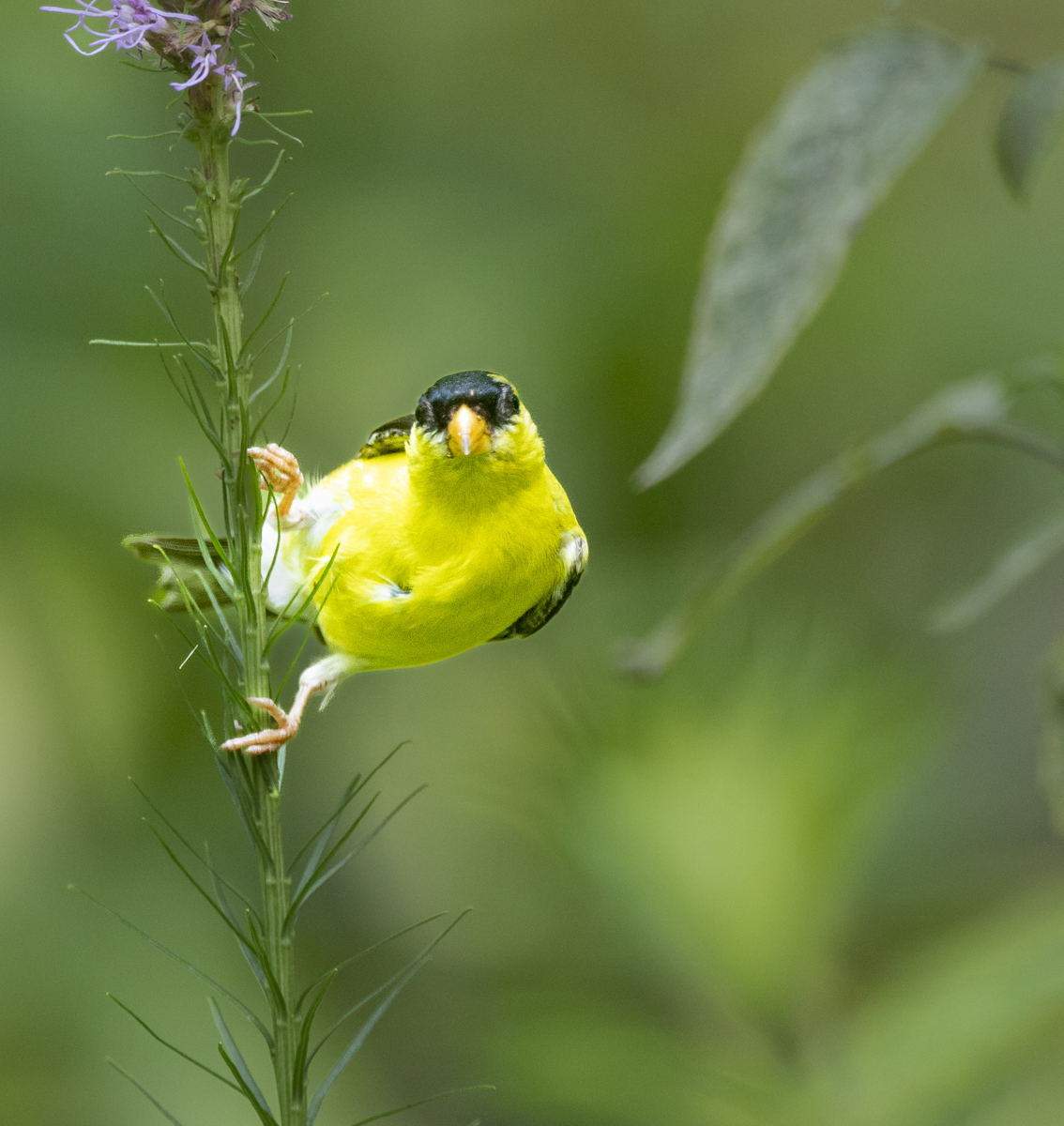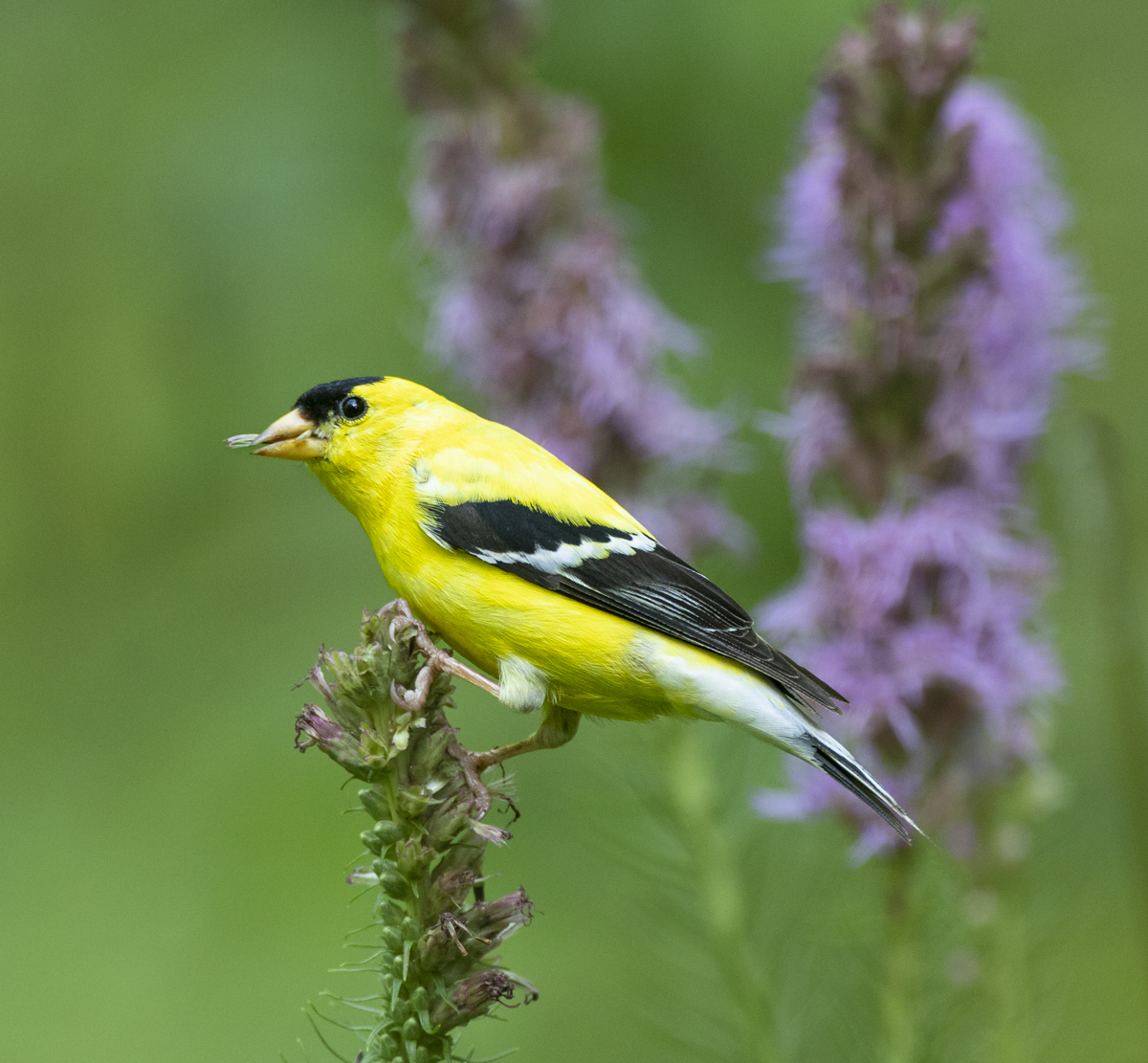 It’s been a very good year for the American Goldfinches in our yard. I haven’t put out thistle seeds this year but the goldfinches seem quite content with the sunflower seeds in the other feeders and, more recently, with the seed heads of various wildflowers scattered around our yard. In late July, they made regular visits to the few Blazing Star (Liatris sp.) plants near the front of the house. Those are planted near one of our water gardens and I have left a screen off of one window so I can open that window to photograph birds coming to the area. Here are a few images from their feeding forays.