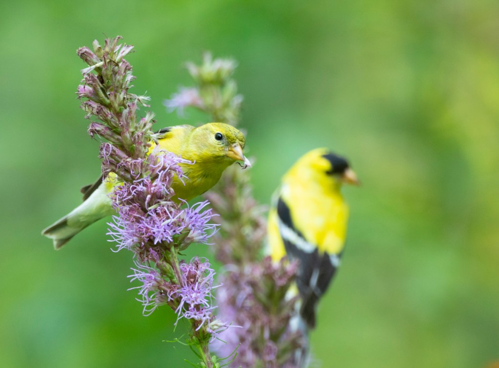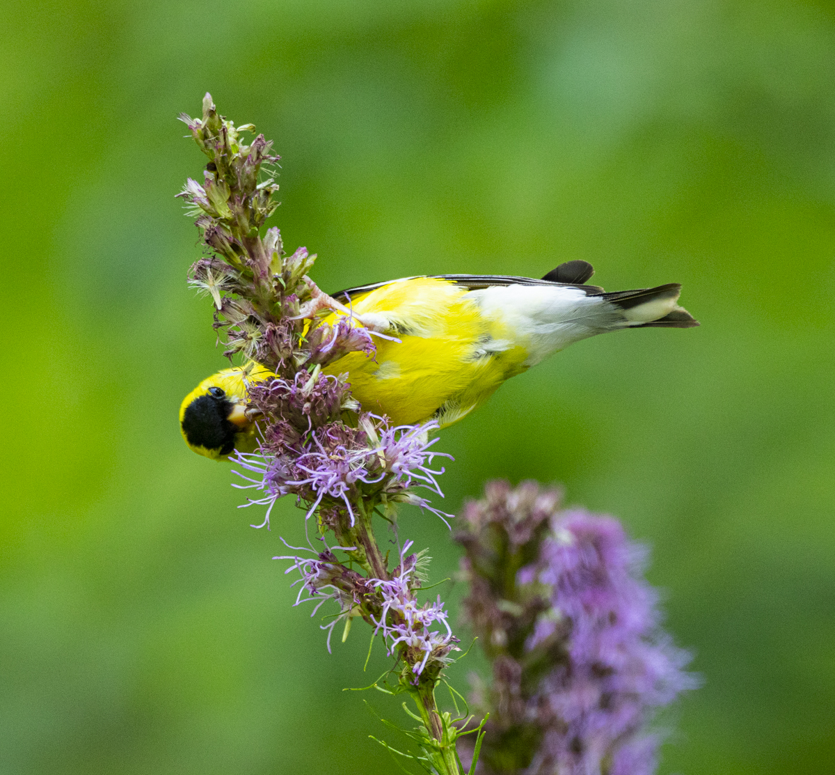 -A female American Goldfinch plucks a seed from a Liatris flower stalk while a male does the same in the background. Liatris spikes mature from the top to the bottom, unlike many other species of flower stalks which usually mature from the bottom up (click photos to enlarge)
