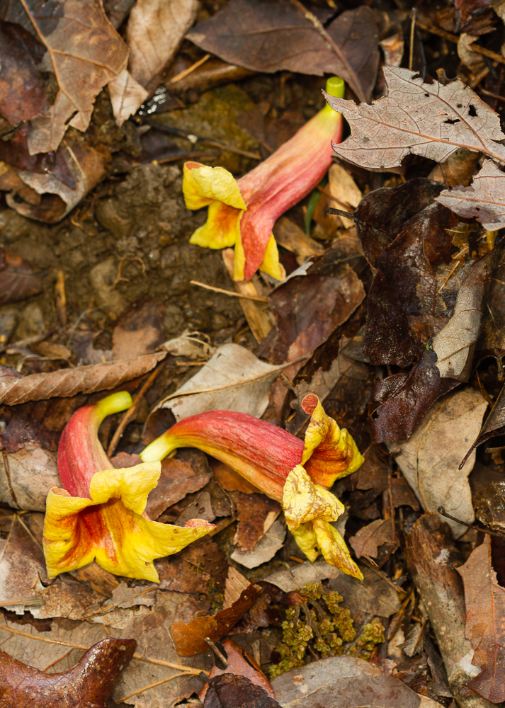 The bright yellow Trout Lilies cannot be overlooked – they stand out against the surrounding greenery for your attention as you hike. Only a small percentage of the plants usually flower in any season (some references say less than 5% typically). Flowering plants have two leaves whereas the vast majority in a population have only a single leaf. The upside down flowers close every night and the petals and sepals re-curve upward again every morning during their short blooming period.