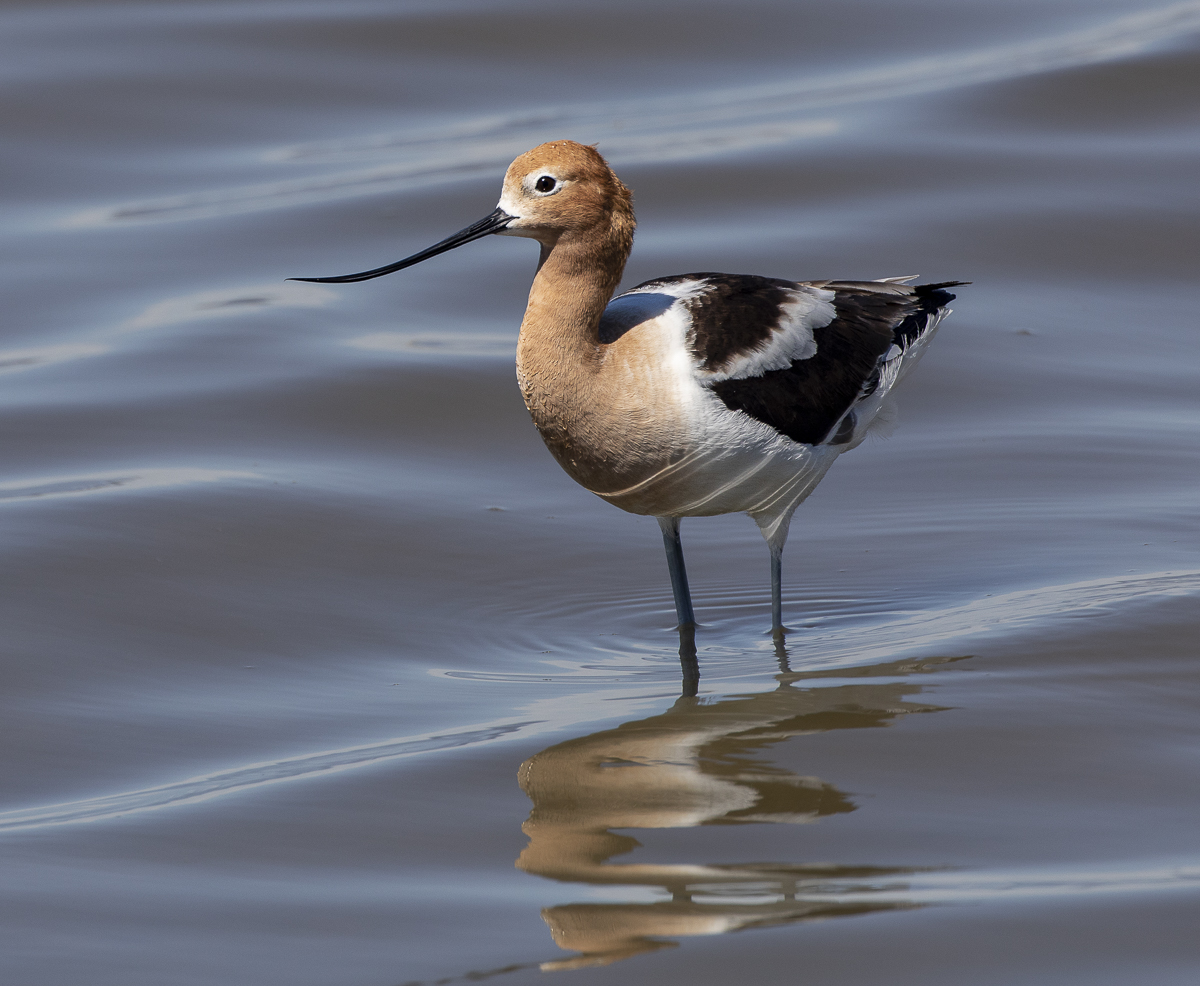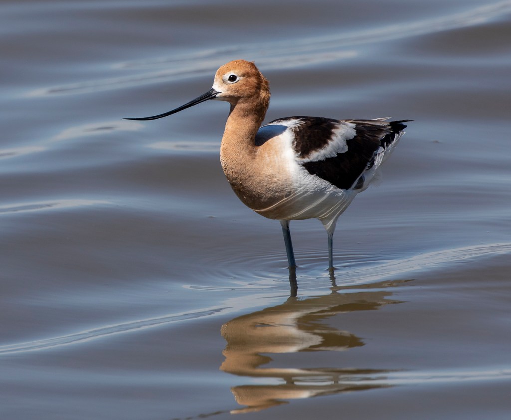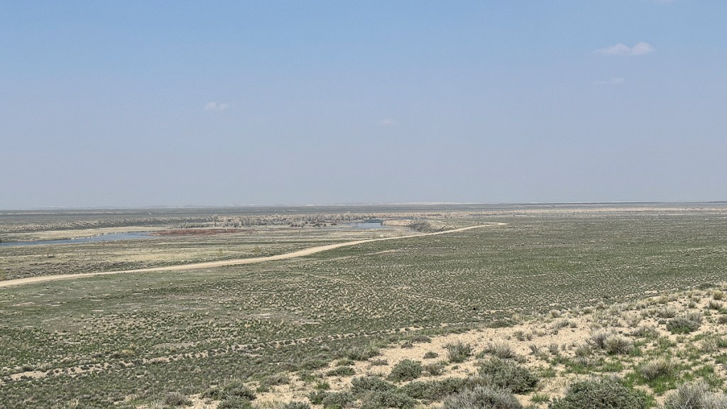 We learned about Seedskadee NWR, just a short drive from the town. The name is from the Crow tribe and means “river of the prairie hen” (which is another name for the Sage Grouse). We drove 20+ miles out to the refuge on a straight road passing through nothing but sagebrush steppe – a dry, flat landscape that dominates much of Wyoming. We finally came to the refuge and sptted a winding green ribbon – the corridor of the Green River (the same river we had camped next to in Dinosaur NM). The Green River courses 730 miles as it flows through Wyoming, Utah, and part of Colorado before joining the Colorado River (and it is that river’s major tributary).