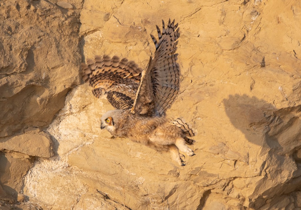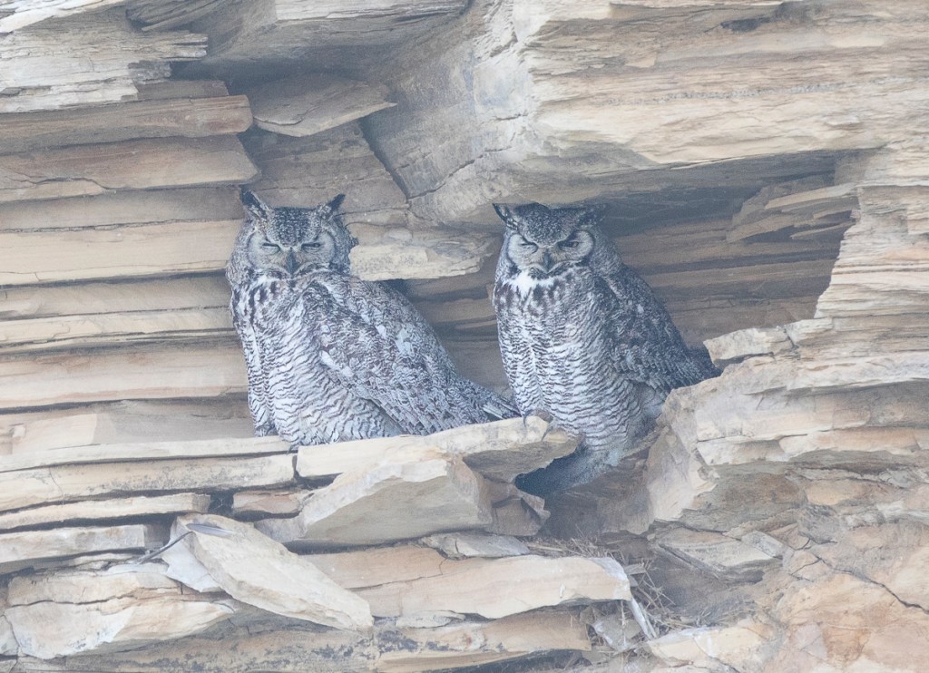 -The next morning I scanned the cliff face and down by the river. Neither the adult nor the fledgling were in sight in the same area. I scanned all along the cliff and was delighted to find a pair of adult owls on another ledge about a hundred yards from the one the previous night. Though we never did see the young bird again, we hope its parents were able to care for it (and maybe any siblings that might still be alive). It looked like a very hazardous place to be an inexperienced owl chick though as the river was fairly wide and very swift at this cliff face.