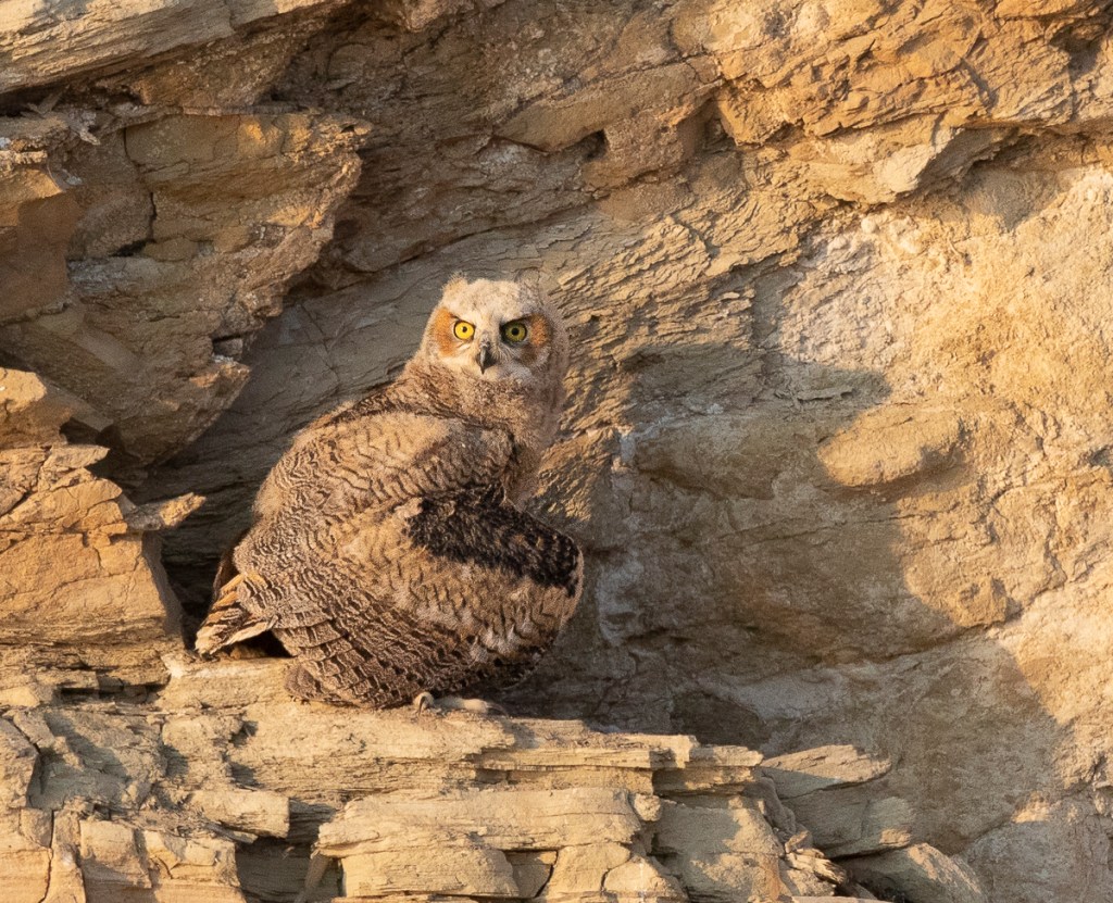 -The young owl continued hopping and climbing until it got to the highest point along its route, where it sheltered in place for the rest of the evening, glaring at anything that dared to move in our campground. I must admit, we both spent a couple of hours watching every move the two owls made. It was an incredibly beautiful scene in this picturesque landscape. I had hoped to see the adult leave for its evening hunt, but it did it as I was at the truck getting dinner (naturally). We did hear it hoot a couple of times, but only the one owl, so we wondered what had happened to its mate.