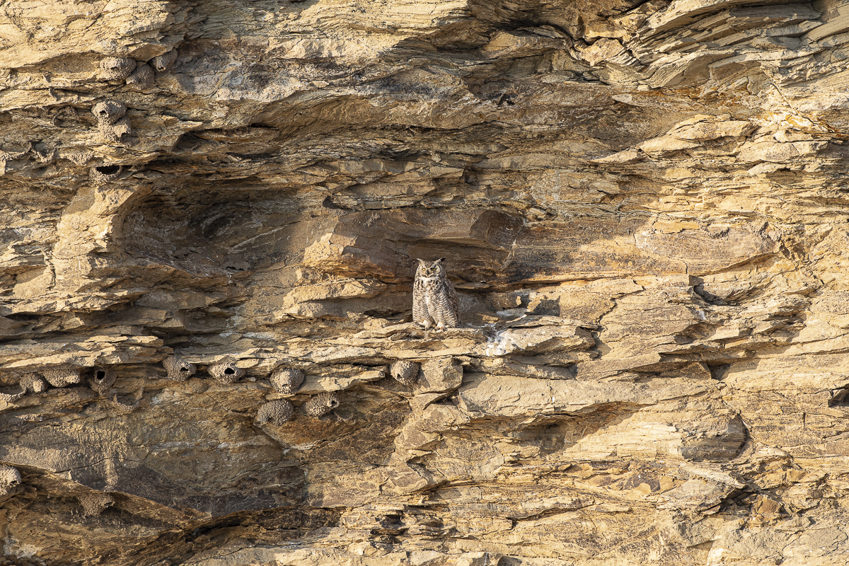 -As the sun lowered in the west, the golden light flooded the area with the owl. Notice the Cliff Swallow nest just below. These images were shot with an equivalent 700mm lens and heavily cropped.