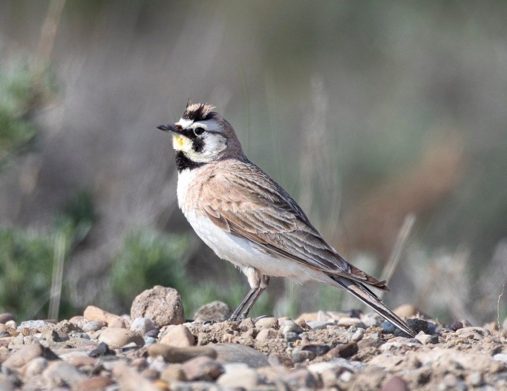 -A Horned Lark alongside the road showing off his tiny “horns”. The “horns” are actually small tufts of black feathers (more prominent on males). During the breeding season, he can raise and lower them to attract females…Melissa, did it work? (photo by Melissa Dowland).